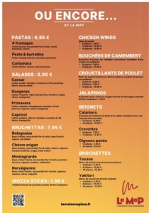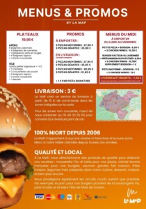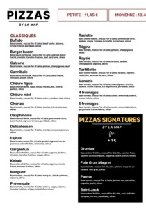 À La MaP, nous sélectionnons des produits de qualité pour élaborer nos recettes : mozzarella Fior di Latte pour nos pizzas, viande bovine française pour nos burgers, saumon gravlax fait maison, frites maison, légumes frais préparés dans notre cuisine, desserts maison, et bien plus encore.